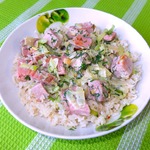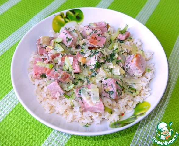 На рис положить рыбу, посыпать укропом и наслаждаться нежным вкусом рыбы в сливочном соусе с хрустящим огурчиком.