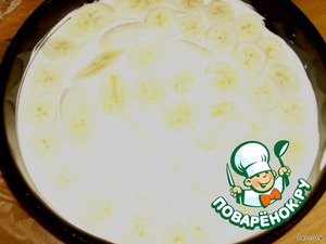 Кладём теперь наш крем, примерно 1/2 часть и на верх кладём бананы (порезанные кружочками).