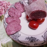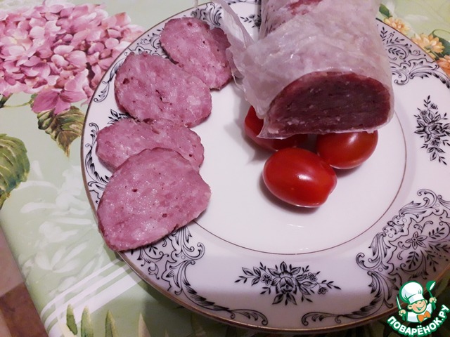 Колбаска получилась плотной, легко резалась. Конечно же, вкусная! Спасибо за рецепт!!!