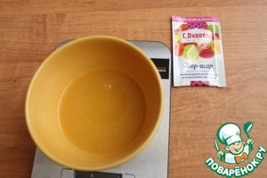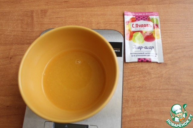 Из апельсина выжать сок, добавить в него агар-агар, перемешать и оставить на полчаса.