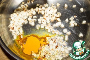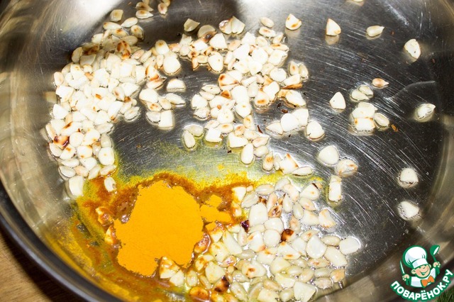 Добавляем в сковороду растительное масло и куркуму, прогреваем минуту.