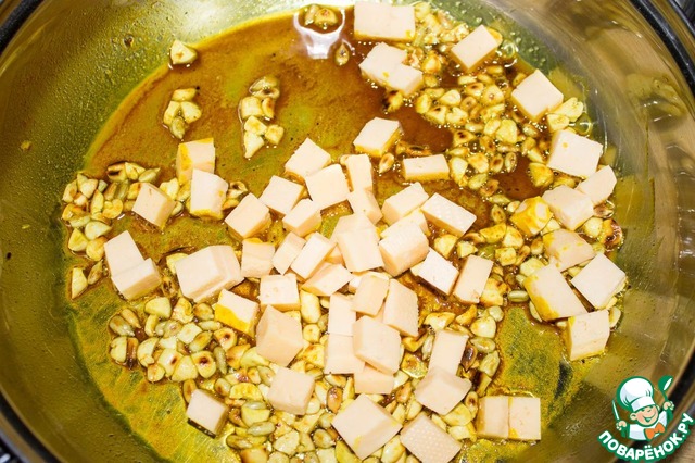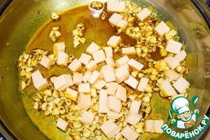 Добавляем кубики сыра и хорошенько перемешиваем, держа на огне еще минуту.