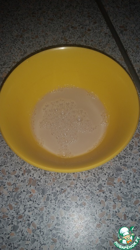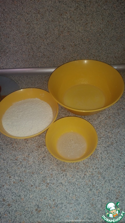 Смешиваем сухие дрожжи с 1/3 стакана теплой воды. Оставить на 10 мин, что бы дрожжи начали "работать". Вода должна быть именно теплой, в горячей дрожжи погибнут и тесто не поднимется.