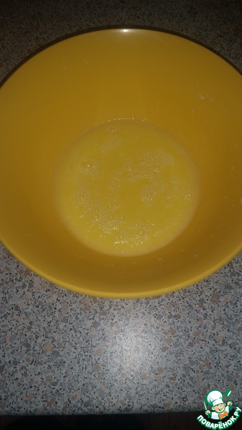 В отдельной чашке смешать растопленное масло, соль, сахар, уксус (у меня яблочный). Перемешать до полного растворения. Добавить стакан кислого молока (можно взять 0,5 ст. молока,0,5 ст воды)