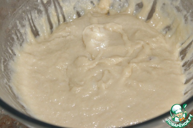 Добавляем муку и замешиваем тесто. Растопленное сливочное масло добавляем частями и продолжаем вымешивать тесто до тех пор пока масло полностью не впитается.