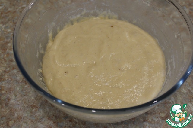Тесто будет жидкое и прилипать к рукам. Миску накрываем пленкой и убираем ее в теплое место на час для поднятия теста.