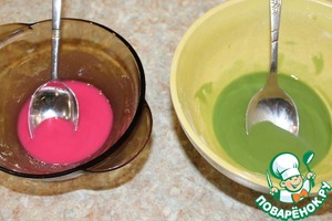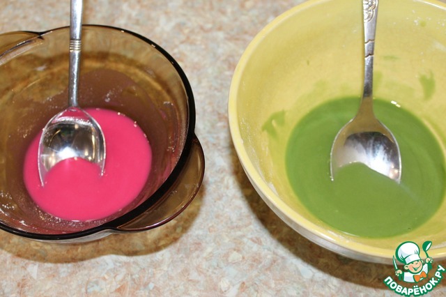 Добавляем воду и лимонный сок в сахарную пудру, перемешиваем. Добавляем пищевой краситель и очень хорошо перемешиваем. -