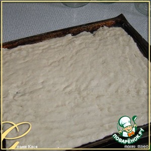 Большой противень мажем маслом (растительным, прямо ладошкой), растягиваем тесто по всему противню, формируя небольшие бортики.