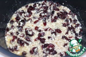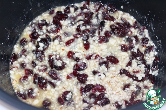 Выкладываем тесто в чашу мультиварки сверху клюквы и орехов. Выпекаем на режиме "Выпечка" 80 минут.