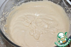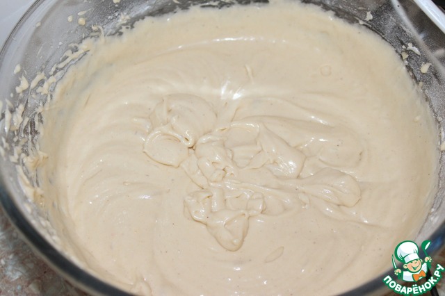 По одному вбиваем яйца и всыпаем ванильный сахар. Поочередно добавляем сметану и мучную смесь.