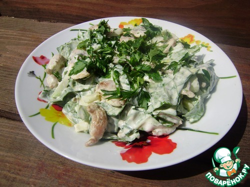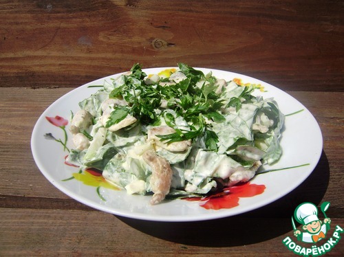 Заправляем наш салат заправкой, хорошо перемешиваем, украшаем зеленью и наслаждаемся.