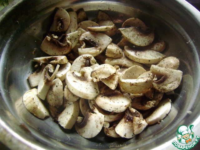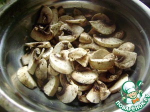 Свежие шампиньоны нарезаем тонкими ломтиками. Солим, перчим и оставляем мариноваться.
