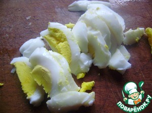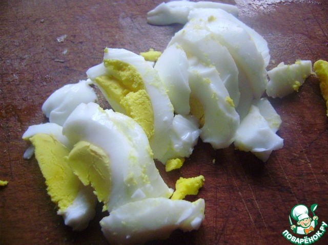 Вареные яйца нарезаем полукольцами.