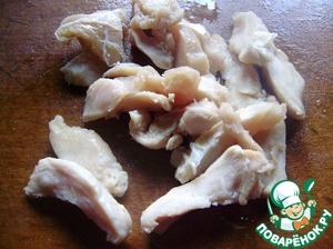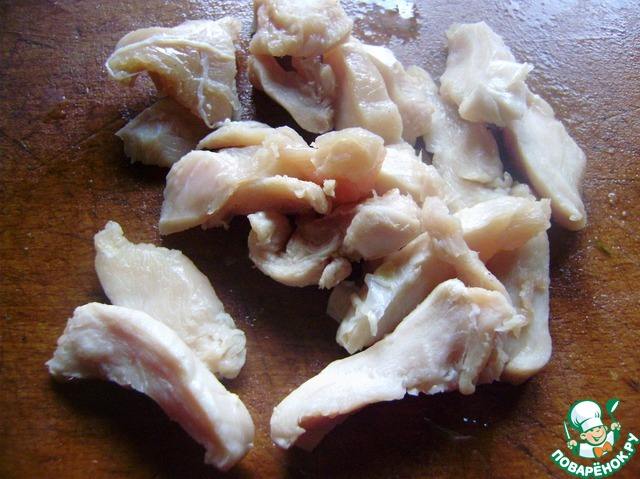 Куриную грудку можно отварить, а можно пожарить. Я предпочитаю жарить, так вкуснее и быстрее. Нарезаем соломкой, солим перчим.