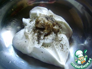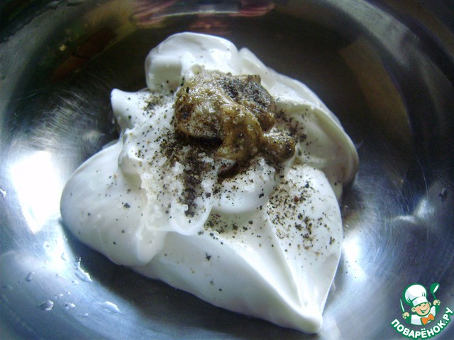 Теперь готовим соус. В сметану добавляем горчицу, соль и перец. Все смешиваем. Если любите майонез, то все эти телодвижения можно пропустить и заправить просто майонезом.
