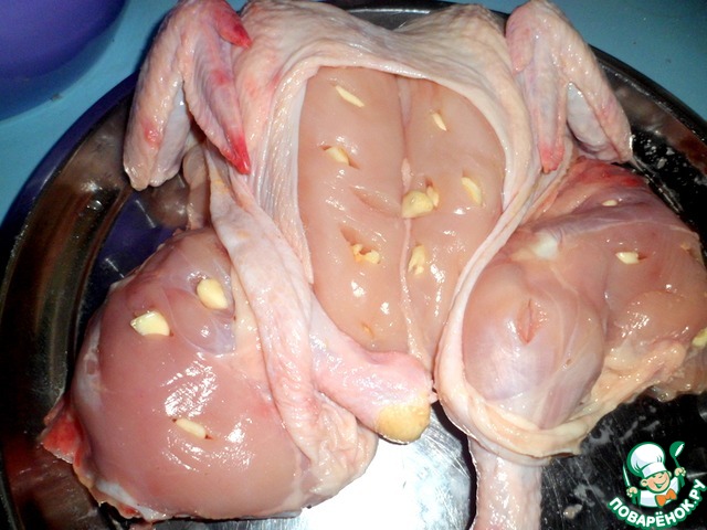 Чеснок нарезать дольками и нашпиговать курицу со всех сторон, под кожей.