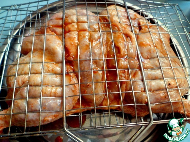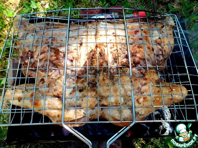 На следующий день приготовить мангал с углями. Курицу уложить на решетку, идем жарить.