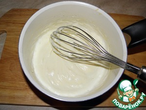 Теперь будем много взбивать. По капельке, именно по капельке!!! вливаем масло, тщательно и интенсивно взбивая желтки венчиком после каждой капельки. После 2-х ст. л. добавленного масла можно чуть побыстрее начать вливать масло, но только чуть!