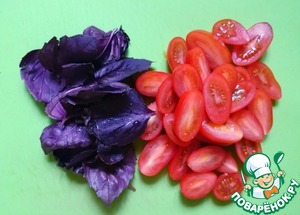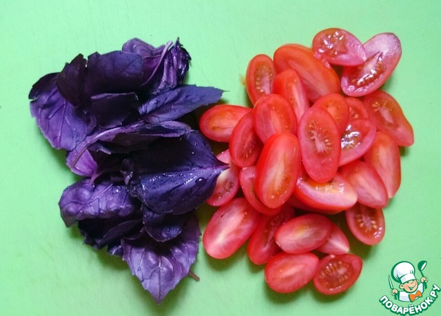 Листья базилика можно порвать руками, помидоры черри разрезать пополам.