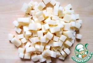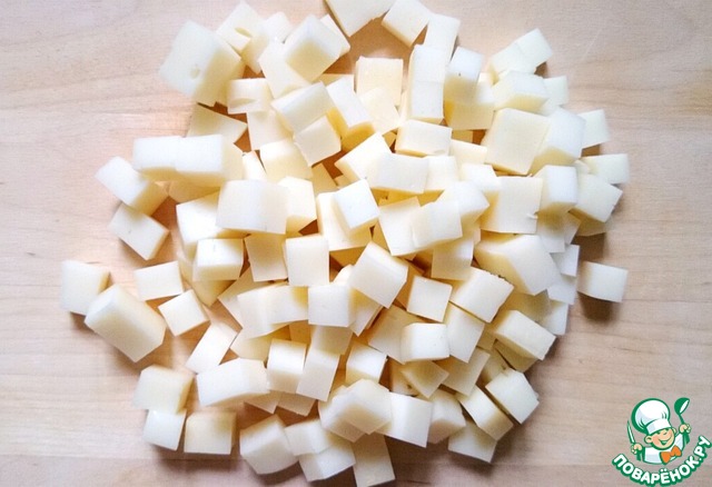 Моцареллу режем кубиками.