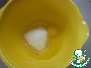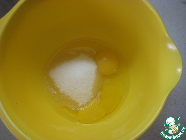 В отдельной миске взбить яйца с сахаром и ванильным сахаром до посветления.
