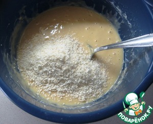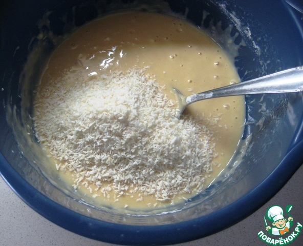 Добавить кокосовую стружку и снова перемешать. Тесто получается гуще, чем на оладьи (с ложки не стекает).