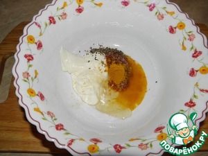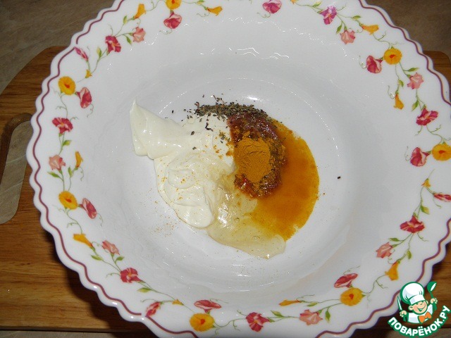 Соединить для соуса-маринада, майонез, мед, аджику, лимонный сок, добавить куркуму и базилик.