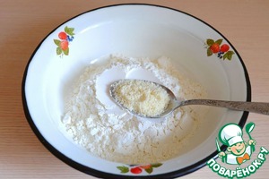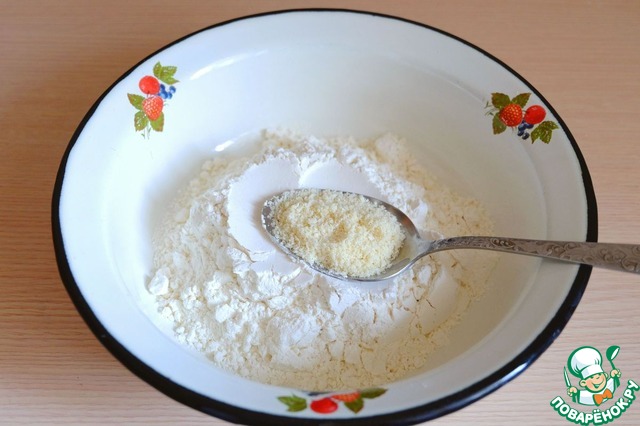 Добавить в миску 1/2 стакана молока. Молоко подогреть. Добавить сахар (1 ст. ложку). Из общего количества муки взять 1 ст. ложку и добавить в теплое молоко. Смесь хорошо размешать, затем добавить 4 гр. гранулированных дрожжей. Смесь еще раз тщательно перемешать, накрыть полотенцем и поставить в теплое место для роспуска дрожжей. Через определенное время на поверхности образуется шапочка из мелких пузырьков. Опара готова