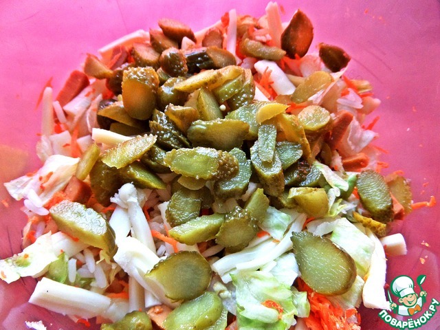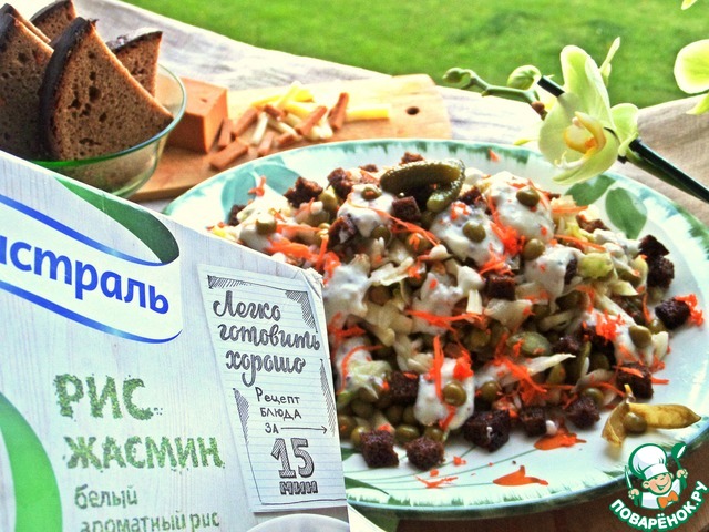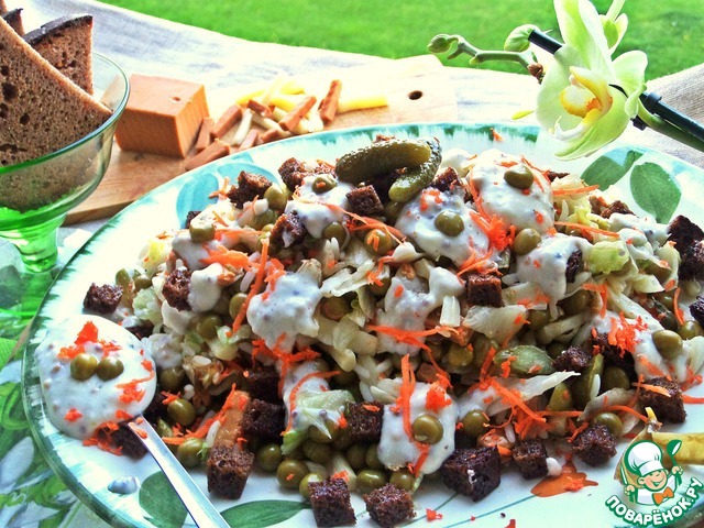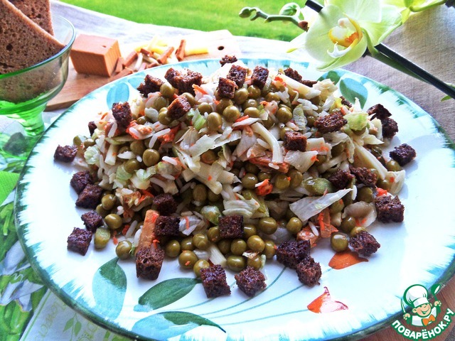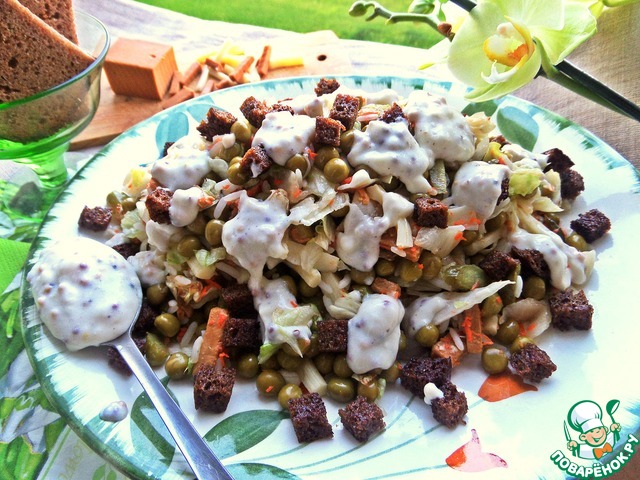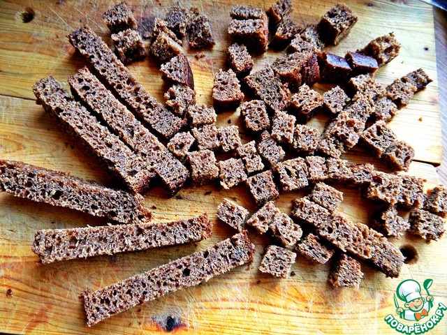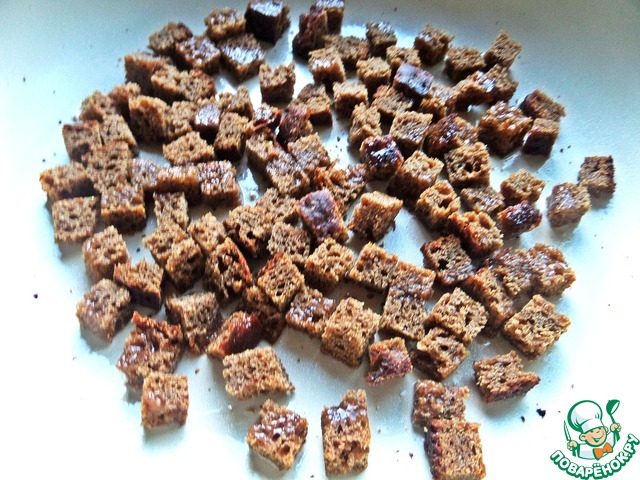 При данной подаче сухарики так быстро не размокнут и очень вкусно попадаются в основном составе салатика, тем более хлеб такой ароматный.