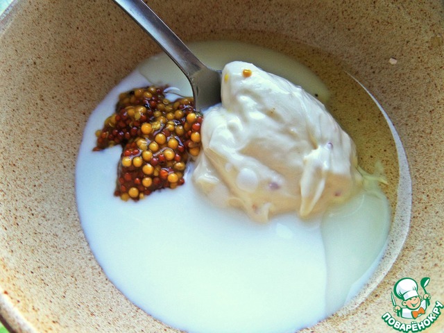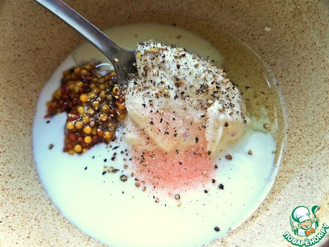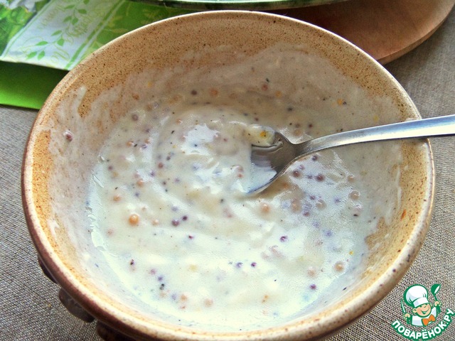 Влить оливковое масло для более жидкой текстуры и горчицу в зёрнышках.