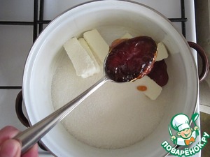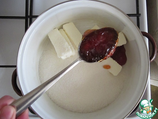 В кастрюлю нарезаем маргарин, насыпаем сахар и кладём варенье. У меня варенье с горкой в ложке.