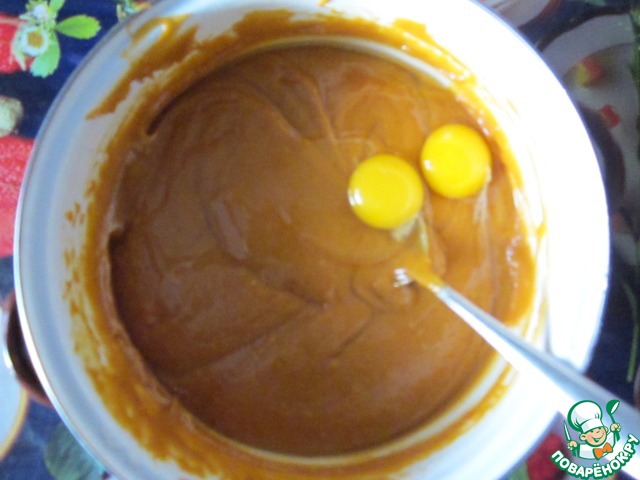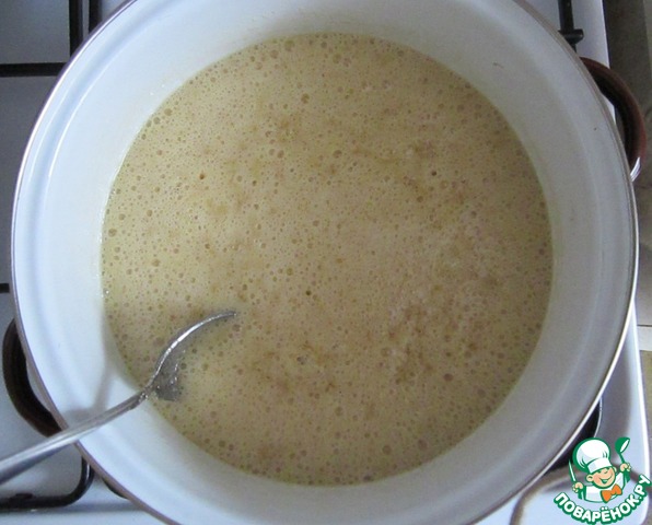 Снимаем с огня и, постоянно помешивая, вливаем тонкой струйкой кефир