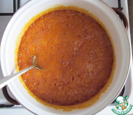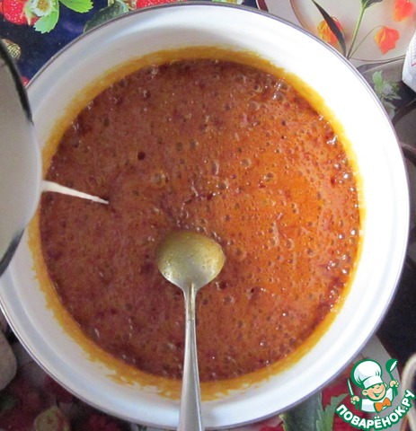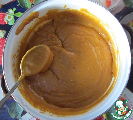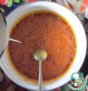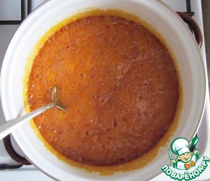 Сначала пена будет беловатая, постепенно начнет карамелизоваться и темнеть. Огонь делаем поменьше, чтобы не пригорело.