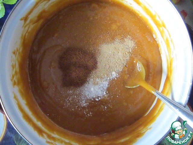 На этом этапе можно всыпать пряности и соль. У меня имбирь, корица, ванилин. В общей сложности сыплю от 1 ч. л. до 1 дес. л. Перемешиваем