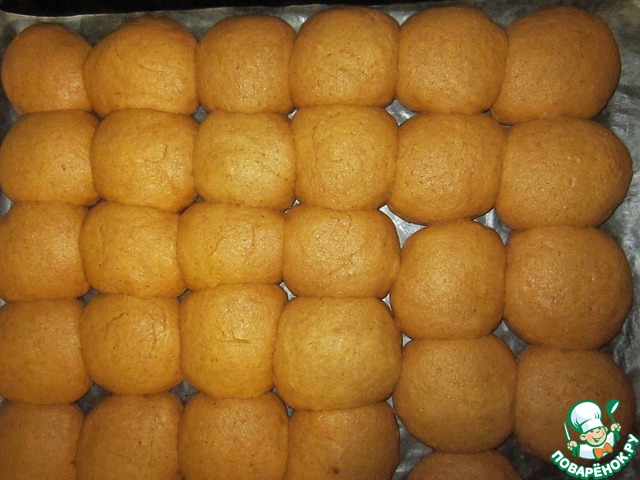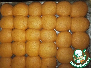 Через час включаем разогреваться духовку до 190-200 С, а затем, припыляя руки мукой или смазывая раст. маслом, лепим небольшие шарики, придавливая сверху и формируя лепешечку толщиной 1-1,5 см. Можно раскатывать через пергаментную бумагу и формировать на ней фигурки, но этим у меня любят заниматься дети. Выкладываем на пергаментную бумагу. У меня получилось 38 штук. Отправляем в духовку на 15-20 мин. У меня духовка капризная, ориентируйтесь как для выпечки обычного печенья
