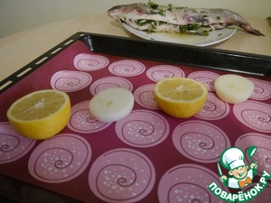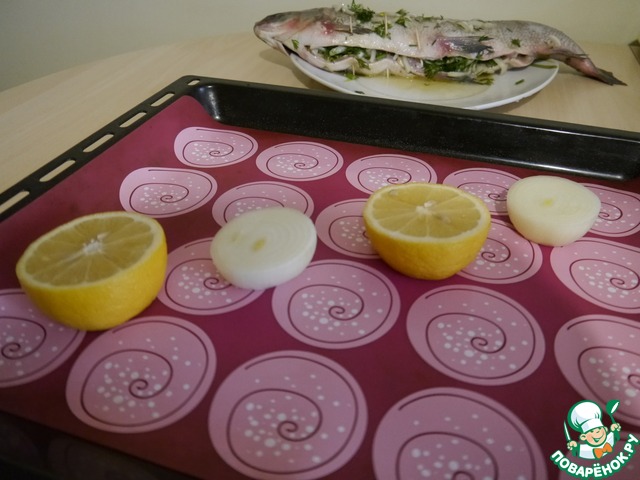 Теперь берем вторую луковицу и лимон, разрезаем их пополам, срезаем острые концы, чтобы половинки устойчиво стояли на противне. Я укладываю их по диагонали противня, потому что иначе рыба не умещается. В оригинальном рецепте рыбу укладывали только на лимон, а мне кажется такой вариант более экономный )). Сверху выкладываем оставшуюся начинку (если осталась) и можно еще дольки лимона. Я лимон не кладу, мне кислоты достаточно. Аккуратно устанавливаем нашу рыбку на "подиум", поправляем если нужно.