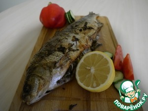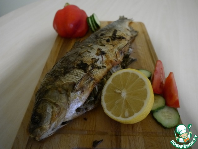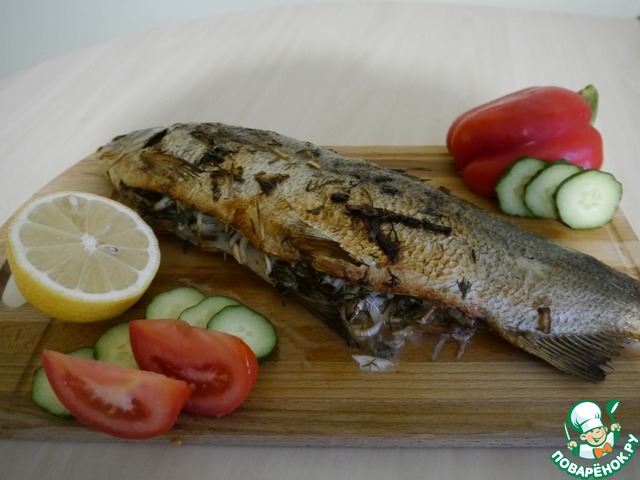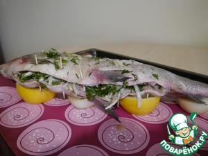 Вот она наша красавица лежит :) Теперь можно включить духовку на 180- 200 градусов (ориентируйтесь по вашему опыту), за время прогревания рыба немного пропитается солью и соками начинки. Запекать 35 -45 минут в зависимости от размера рыбы.