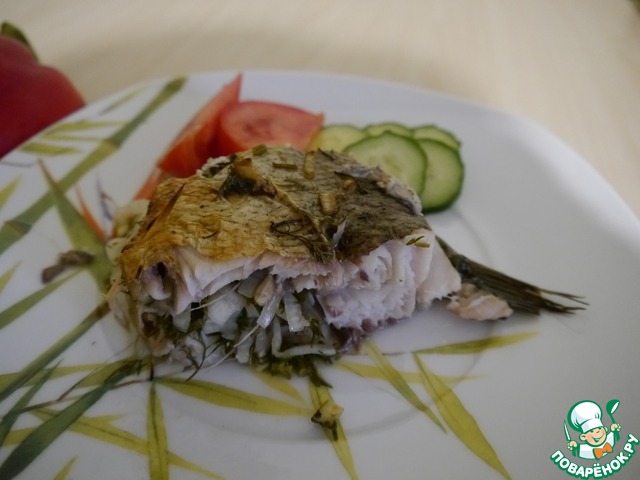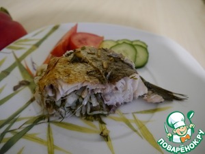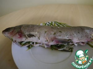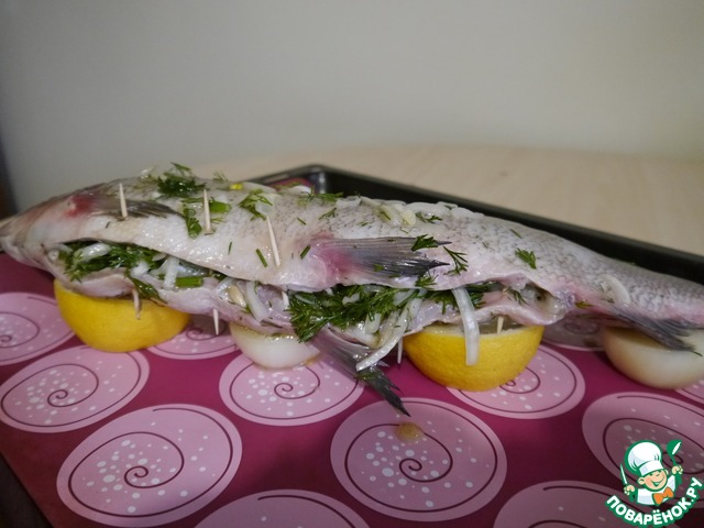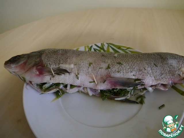 Подготовленную рыбу посолить, поперчить, обмазать оставшимся маслом снаружи (внутри начинка с маслом) и заполнить смесью лука и укропа. Постараться сделать это достаточно плотно. Если вся начинка не влезла (лук крупный или рыба маленькая) - не страшно, просто уложите её сверху рыбы. В этот раз у меня уместилось всё внутрь. Закрепить края брюшка зубочистками.