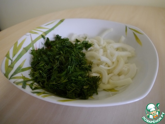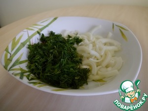 Нарезаем 1 луковицу полукольцами, укроп тоже не очень мелко (без фанатизма).