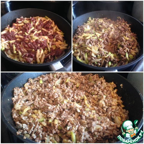 Печень вымыть, обсушить, нарезать на длинные кусочки и добавить к кабачкам.