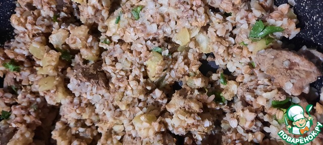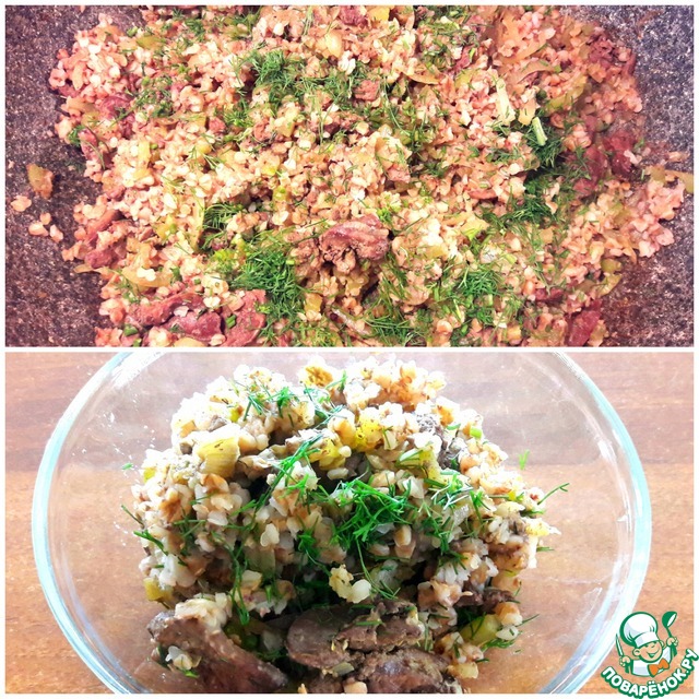 Гречка готова, вынимаем пакетик из воды, разрезаем и высыпаем в печенку с овощами, добавляем нарезанную зелень и перемешиваем.