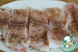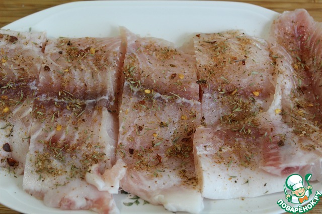 • Рыбу порезать на порционные куски и с двух сторон посыпать специями и чуть солью.