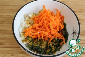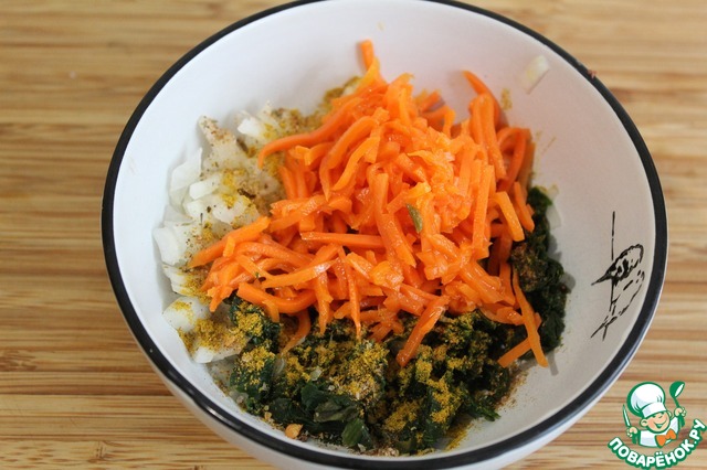 • Лук мелко порезать кубиком, добавить размороженный шпинат и морковь по-корейски (я порезала морковку, сделав ее покороче).