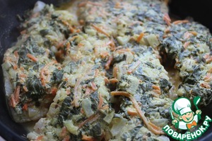 • Выкладываем овощи на рыбу и ставим сковороду на огонь, накрыв крышкой.