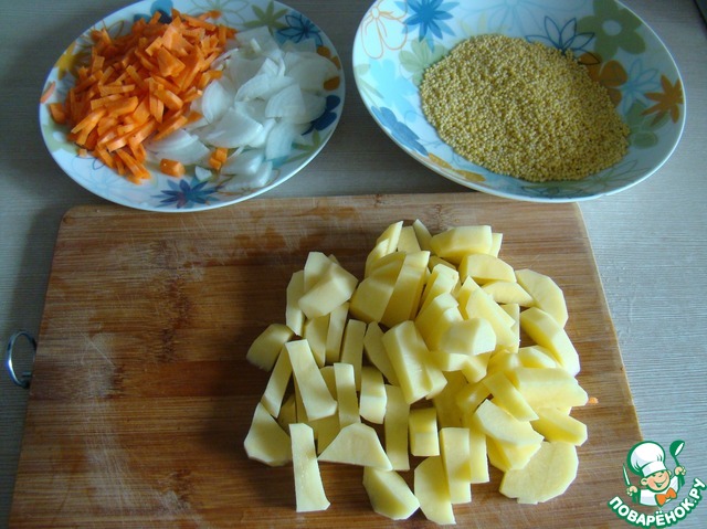 Промыть пшено, порезать полукольцами лук, соломкой морковь, брусочками картофель.