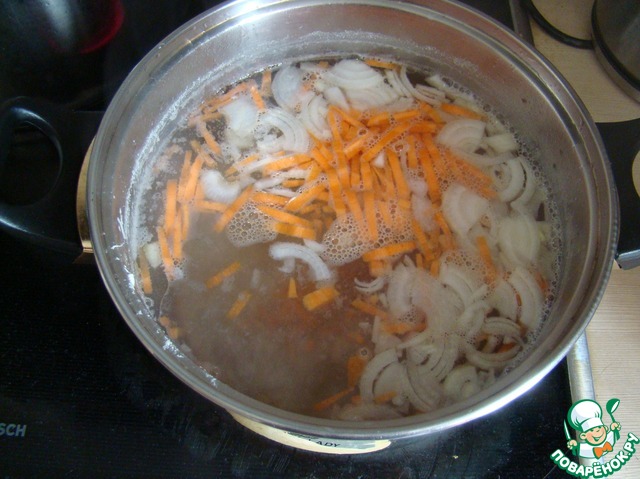 Первыми в кипящий бульон положить лук и морковь, после закипания варить 3-4 минуты.