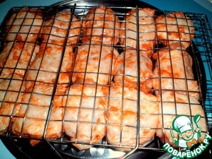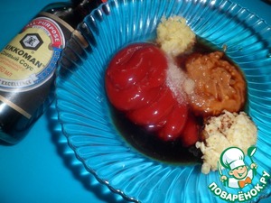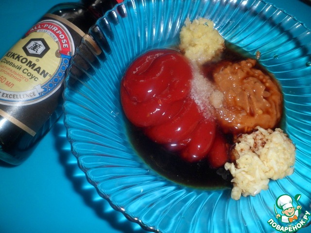 Приготовить маринад. В соевый соус добавить горчицу (можно любую), масло, соль, кетчуп, натертый имбирь свежий и чеснок.