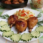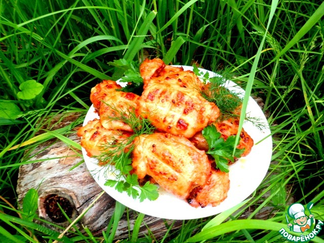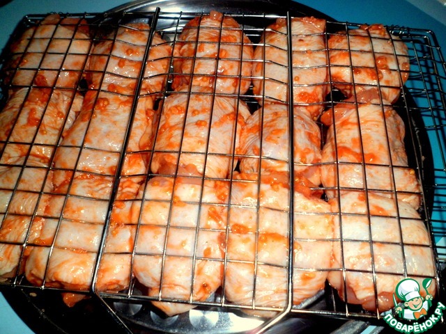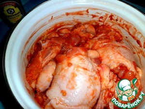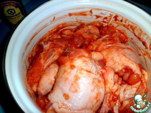 Тщательно маринад перемешиваем с бедрышками, методом замешивания теста. Т. е. хорошо втираем маринад в мясо, без фанатизма.