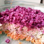 5. Подготовленные овощи уложить слоями на блюдо в кольцо, поливая каждый слой майонезом с желе и прослаивая ломтиками сельди в следующей последовательности: