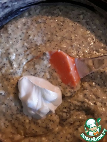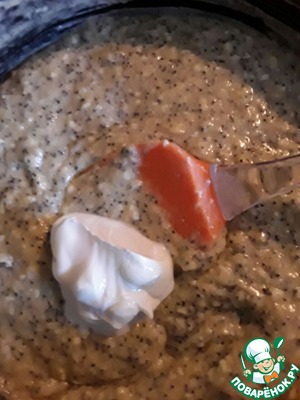 В последнюю очередь добавляем в тесто сметану и снова все тщательно перемешиваем.